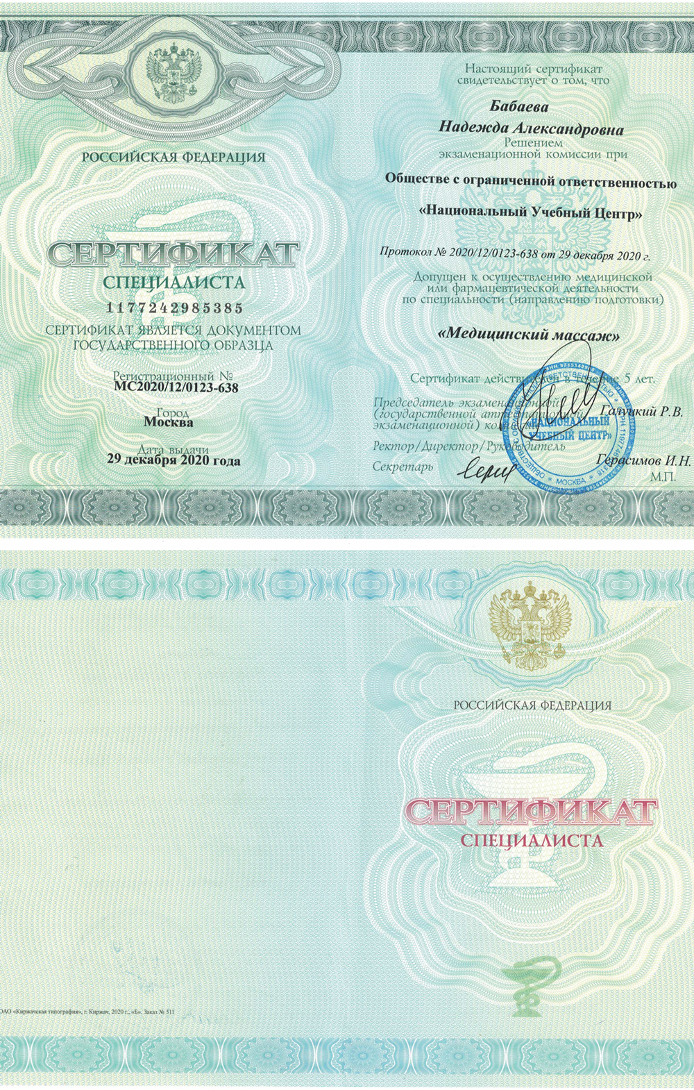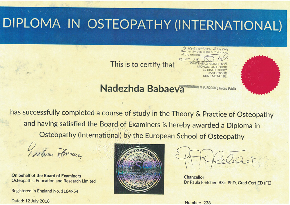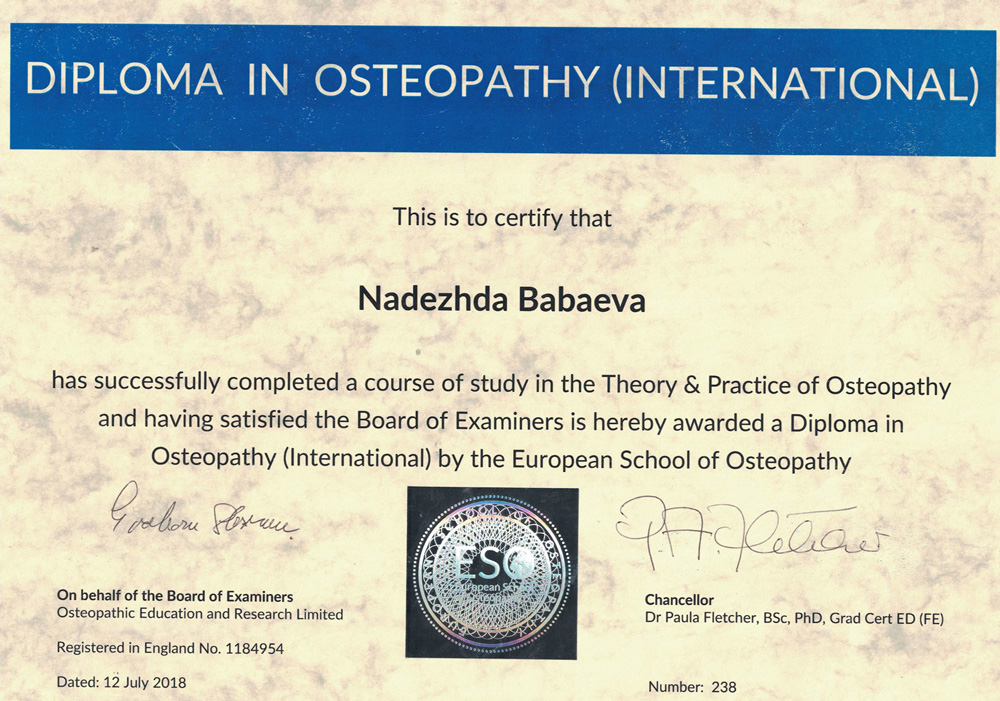 Образование2020 г.Закончила Европейскую Школу Остеопатии и продолжаю свои исследования, являясь Членом колледжа краниальной остеопатии Сазерланда (Великобритания).